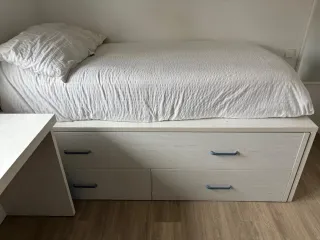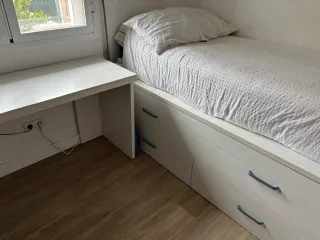 Cama nido de 90 cm, ideal para optimizar el espacio. - Estructura de madera. - con colchones. El de la cama de abajo sin usar ya que era solo para invitados. - tiene tb cajones con mucha profundidad Cajonera de 110 cm de altura , 40 profundidad y 100 cm de anchura disponible a juego También a juego estantería de 100cm con mucha capacidad y un escritorio. Todo como nuevo. Ni un desconchado ni golpes