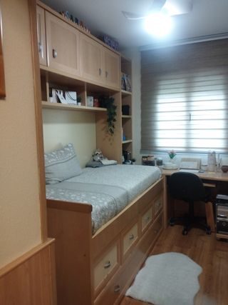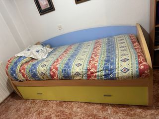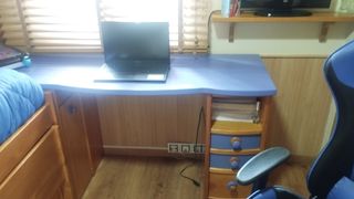 Habitación desde niño hasta adulto , madera maciza de muy buena calidad, súper súper cuidada, bonito color, se puede pintar en otro color el azul precioso que tiene por otro , cama nido con tres cajones en la parte de abajo grandísimos, para meter juguetes, ropa, o lo que se quiera , arriba también, buen espacio para ropa , cajas y demás cosas, encimera para estudiar, librería , y cama bajera con ruedas para no rallar suelo, cómoda para sacar con un sólo tirón . A parte también tres baldas para poner TV, o adornos varios, libros etc.. combinado con madera y azul de la misma madera que el mueble. Silla comodísima cuero y zapatero tb