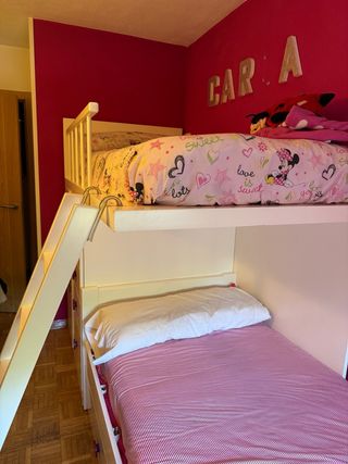 Literas de madera en color blanco haciendo aguas en malva o gris. Se compone de 3 camas, dos literas y una cama nido. Se incluyen los 3 colchones a medida, apenas usado. Se vende por mudanza. Actualmente desmontado,. Se pueden poner las camas por separado o en vertical (literas) El comprador se encarga del porte. Me urge venderlo.