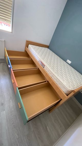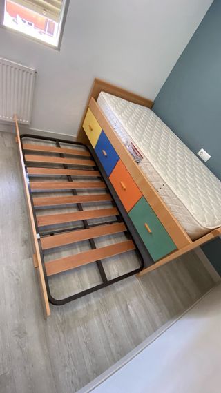 Se vende cama nido con cajón inferior y dos colchones. - Estructura de madera. - Cajón de color verde. - Colchón superior - Colchón inferior de tela.