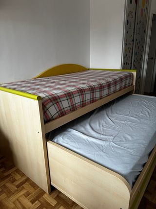 Cama nido seminueva con capacidad para dos personas. Incluye dos colchones y dos somieres. - Estructura de madera. - Colchones de tela.