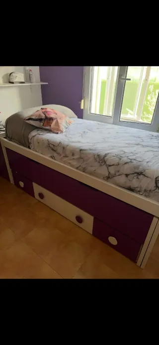 Todo lo que va en las fotos, cama nido, armario, mesa, sinfonier y estanterias juvenil en tonos morados y blancos. Está en buen estado, aunque tiene algunas señales de uso. - Incluye cajones amplios para almacenamiento. También se venden colchones, estanterías, sinfonier y armario, todos los muebles de la foto. - Perfecta para habitaciones juveniles. Precio a convenir