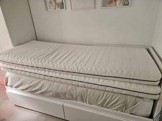 COLCHÓN: .Medida: 90x190cm .Colchón de muelles ensacados, fabricado en España .Era el colchón de la parte inferior de una cama nido y nunca ha sido usado (ha estado bien protegido para su conservación) SOMIER: .Medida: 90x190cm .Fabricado en España con madera de Haya combinada. .Tubo acerado 30x30x1 de 1°calidad. . Las patas pueden plegarse , por lo que, pueden están desplegadas si usas el somier y recogidas para guardarlo cómodamente si lo quieres tener como cama supletoria. PRECIO: (Se venden juntos o separados) . Precio juntos: 89€ . Precio por separado: 49€ cada pieza SÓLO RECOGIDA EN PERSONA EN VENTA DE BAÑOS (PALENCIA)