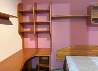 Muebles de habitación juvenil en madera. Ideales para una habitación juvenil. - Incluye cama nido con dos camas - Armario ropero de dos puertas con estantes y barra. - Conjunto de estanterías y escritorio a juego. - Perfecto estado de conservación. -Medidas cama 200X95 cm. -Armario principal 90X237X46 cm. -Armarios laterales puente 45X237X46 cm. -Puente 200X100X30 cm. -Mesa escritorio 100X166X60 cm. Con silla a juego. -Lampara de techo a juego con la habitación.