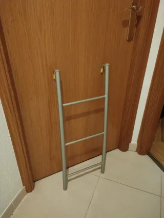 Escalera metálica plateada para cama. - Tres peldaños. - Ganchos para colgar. Es para camas que, al ser cama-nido, quedan altas para los niños.