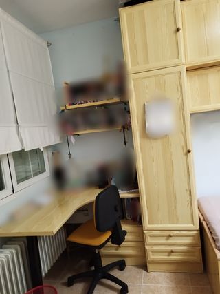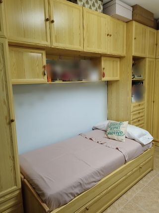 Se vende dormitorio juvenil en perfecto estado, tal como se ve en las imagenes. Se incluye: - Cama nido de 90 cm con cajoneras para almacenaje. - Escritorio en L con mueble de cajones. - 2 modulos de estanteria. - Lampara de techo. Se puede ver sin compromiso.
