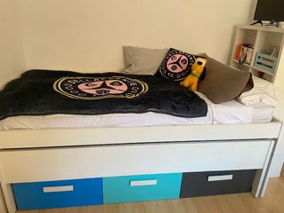 Se vende conjunto de cama nido con tres cajones de gran capacidad abajo. Cama principal de 90x190 y caja de abajo 80x190. Hay una lama de la cama de abajo rota, aunque no afecta a la utilización y a la confortabilidad, precio lama Amazon 6 euros.Precio de compra 690 euros. Se entrega desmontada