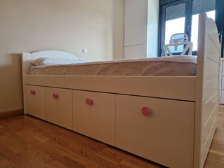 Cama nido con 4 amplios cajones, medida de cada cajón 40cm de ancho, 78 de fondo x 23 de alto. Madera lacada de alta calidad. Prácticamente nueva, muy poco usada. Color blanco con tiradores circulares rosas. Incluido colchón Lo Mónaco, cubre colchón acolchado y barandilla de madera rosa.