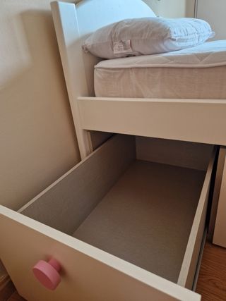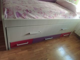 Cama nido con tres cajones amplios y dos somieres. Está en muy buen estado. - Incluye dos somieres.( Uno de ellos sin estrenar) - Tres cajones espaciosos para guardar ropa u otros objetos. - Estructura robusta y elegante.