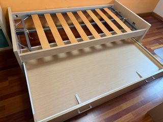 Cama nido con un diseño moderno y funcional, perfecta para optimizar el espacio. - Estructura principal de madera de Haya - Un cajón integrado con tiradores que sirve como almacenaje o soporte para segundo colchón El colchón no está incluido, solamente se vende la estructura. Medidas 204 x 101 cm Altura 48 cm Se debe recoger en mi casa, no se envía.