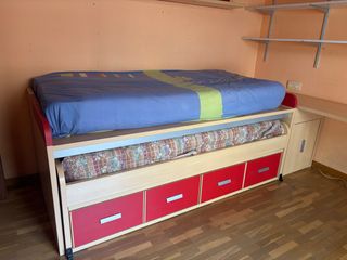 Conjunto de dormitorio juvenil con cama nido, dos colchones de 90 cmx 200 cm, escritorio integrado, cómoda alta con 5 cajones, varias estanterías. Para recoger en Zamora ciudad.