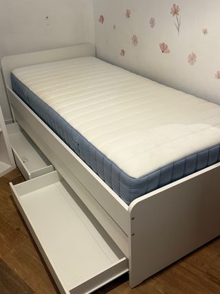 Cama nido infantil de madera en muy buen estado. Es perfecta para dos colchones. Incluido colchón y somier principal, somier de segundo colchón también en el pack, 3 cajones gran capacidad en la parte inferior. - Estructura de madera robusta y resistente. - Dos cajones amplios para guardar ropa de cama. - Diseño sencillo y funcional, ideal para habitaciones infantiles.