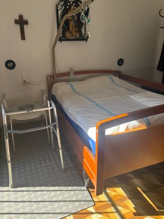 Cama geriatrica con colchón de 1'05cm por 1'90cm. En óptimas condiciones. Se compró en mayo de 2023 y se uso únicamente un par de meses. Las dos fundas que lleva el colchón están lavadas. Cama geriátrica / hospitalaria ideada para personas mayores, enfermos o de movilidad reducida. Articulada en cuatro planos y elevable en altura mediante un carro elevador, todo accionado de forma electrónica desde el mismo mando.