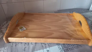 Bandeja de madera con asas, ideal para usar en la cama o como mesa auxiliar. - Fabricada en madera. - Cubierta transparente de plástico.