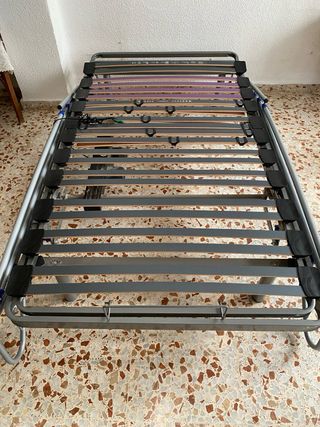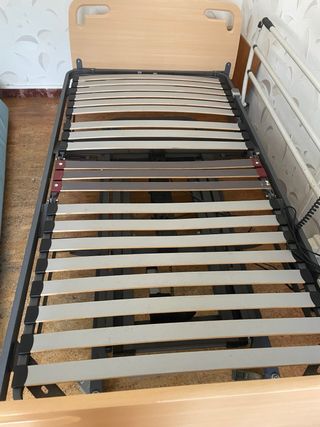Estructura de cama hospitalaria con somier de láminas. SIN ESTRENAR el enfermo no llegó a utilizarla - Marco principal de madera. - Base de láminas de madera y soportes de plástico. - Laterales de metal. Totalmente NUEVA SIN ESTRENAR Precio nuevo 1400