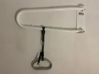 Trapecio de pared para ortopedia, diseñado para facilitar el movimiento y la sujeción a enfermos y ancianos. - Estructura metálica blanca. - Asa de sujeción gris con correas negras.
