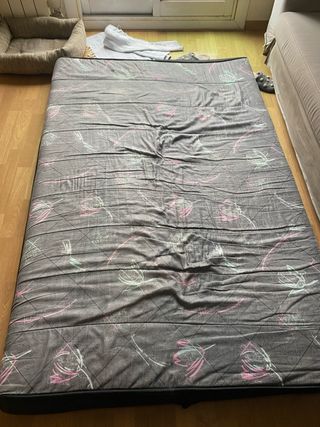 190×75×7,5cm ES: Colchón enrollable de espuma de alta densidad de 3" — muy cómodo y con buen soporte. Usado unas 20 veces con sábana, así que está en excelente estado. Incluye bolsa de transporte y dos correas de sujeción. Funda de terciopelo lavable, base antideslizante. Ideal para dormir en el suelo, para invitados, camping o furgoneta. Tamaño: pequeño individual. EN: Roll-up floor mattress with high-density 3" foam—super comfy yet supportive. Used only around 20 times with a sheet, so it's in excellent condition. Comes with travel/storage bag and two buckle straps. Soft washable velvet cover, anti-slip bottom. Size: small single