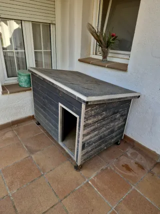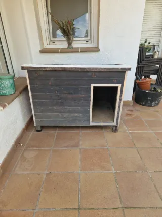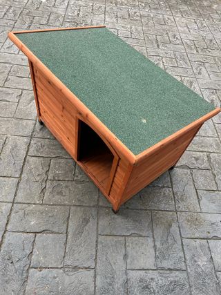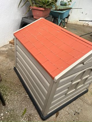 Caseta para perros de plástico resistente. Su diseño proporciona un refugio cómodo y seguro para tu mascota. En Amazon nos costó más de 80€. - Material duradero. - Fácil de limpiar. - Techo a dos aguas. Está como nueva, sólo le faltan los tornillos pero en cualquier ferretería se pueden conseguir. De ahí el precio. Incluye las instrucciones de montaje Cualquier duda pregunten