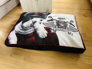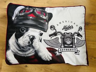 Cama para perro con un diseño divertido de American Rider. - Ilustración de un bulldog con casco y gafas. - Estampado de motocicleta con alas. - Borde decorativo. - Medidas: 60x80cm