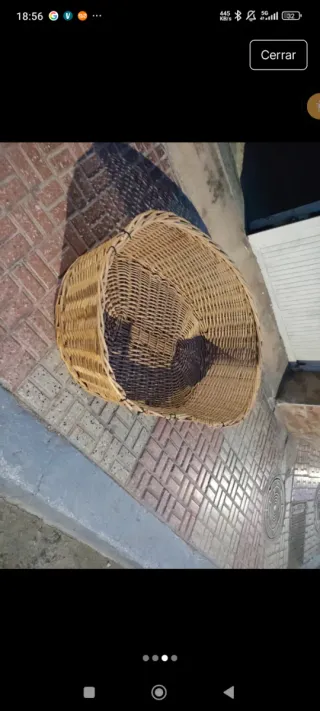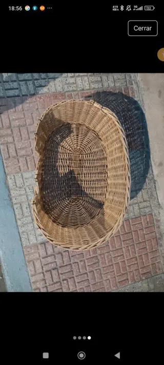 Cesta tejida a mano, con 2 cojines, ideal como cama de mascota. - Tiene 2 asas orejas de gato - Material de mimbre natural. - 1 Cojín redondo y confortable - Otro cojin tubular, que recoge a la mascota - Por su tamaño es adecuado para gato o perro pequeño - Nueva, ningún uso.