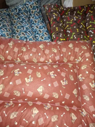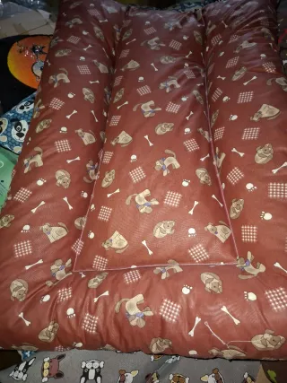 camas para perros con divertidos estampados.65x95.loneta de algodón por arriba (la marrón es como tela de gabardina) y ,como fliselina abajo.rellena de copos de espuma. - Diseños variados en tonos azules y marrones. - Tejido resistente y acolchado.