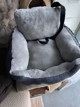Cama para perro diseñada para viajar en coche. Es cómoda y segura para tu mascota. - Material suave y acolchado. - Correas de sujeción para el asiento del coche. He dejado a las mascotas cerca porque ayuda a conocer las dimensiones aprox son 50x40x38