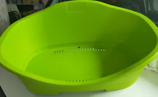 Cama para perro de plástico resistente con diseño ventilado. - Forma ovalada. - Base con múltiples ranuras para ventilación. - Borde elevado para mayor comodidad. - Se le puede añadir un cojin o almohada. - Medidas: 60 cm de largo × 40 cm ancho × 20 cm de alto.
