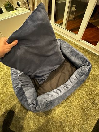 Está totalmente nueva, cuando se la compré a mi perra me miró diciendo que era pequeña para mi y se subió al sofá jajaja! En fin tengo perdida la batalla! Por si os sirve de referencia mi perra pesa 8,5kg - Medidas: 60x50x11cm. (Xs) - Material exterior de pelo largo en tonos grises. - Interior acolchado en color beige. - Colchón interior extraible con su propia funda para lavar.