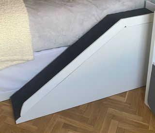 Rampa de madera hecha a mano con adhesivo para el agarre de sus patitas. Ideal para que pueda subirse a la cama o al sofa.