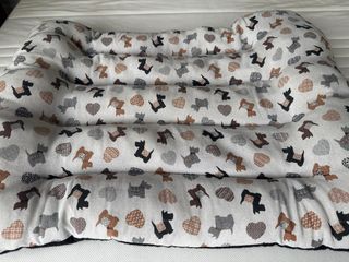 Cama acolchada para mascotas con estampado: - Diseño con perros y corazones. - Tejido suave y cómodo.