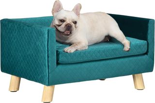 Cama moderna para perros de pequeña talla, dimensiones 70L x 47P x 30A cm, adecuada para perros de hasta 4.5 kg y 35 cm de longitud. Estructura de madera de pino con 4 patas para estabilidad. Asiento acolchado en espuma y revestido en tejido de poliéster efecto peluche, con amplio respaldo para soporte. Fácil de limpiar gracias al material resistente al agua. Incluye un cómodo cojín (52L x 33P x 3A cm). Diseño elegante, ideal para salón o dormitorio. Montaje requerido. Perfecta para ofrecer comodidad y un ambiente acogedor a tus animales.