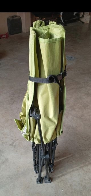Cama plegable para acampada. Es de color verde y parece estar en buen estado. - Ideal para excursiones y campamentos. - Fácil de transportar y guardar.