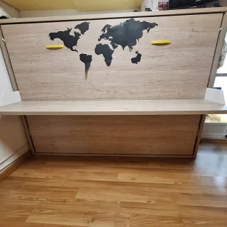 Cama plegable horizontal de madera de roble en muy buen estado, limpia y bien conservada, ideal para espacios reducidos. Estructura de 208,7 x 45 x 153 cm; abierta sobresale 164 cm. Para colchón de 135 x 190 cm (hasta 20 cm de grosor) e incluye somier de láminas integrado. Incorpora escritorio sincronizado de 202 x 42 cm que se pliega junto con la cama, permitiendo dejar objetos de hasta 14 cm. Sistema con pistones hidráulicos, cierre amortiguado, bloqueo de seguridad, patas metálicas y gran estabilidad. Pegatinas decorativas removibles. Colchón incluido. Recogida en persona o punto a acordar. Precio ligeramente negociable.