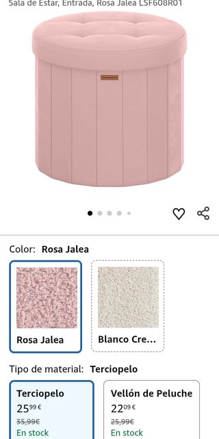 Puff redondo SONGMICS Mazie en terciopelo Rosa Jalea, perfecto como asiento extra, reposapiés o solución de almacenaje en salón, dormitorio o entrada. Su estructura de MDF de 9 mm reforzada con un aro de acero ofrece gran estabilidad y soporta hasta 150 kg. El asiento de 46 cm de diámetro incorpora espuma de 5 cm para mayor comodidad. Incluye un amplio compartimento interior de 65 L (44×42 cm) ideal para guardar ropa, mantas o accesorios. Diseño plegable para montaje rápido y almacenamiento compacto bajo la cama o en armario. Elegante, práctico y muy versátil.