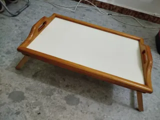 Práctica bandeja de madera con patas plegables, ideal para usar en la cama o el sofá. Su diseño permite apoyar objetos de forma estable. - Material: Madera - Color: Madera natural y blanco