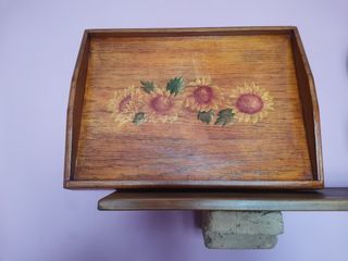 Bandeja de madera con decoración de girasoles, patas plegables. Bandeja auxiliar para comer en cama sofá etc.