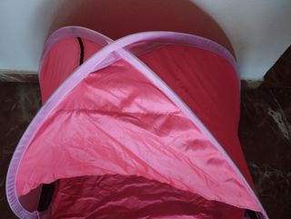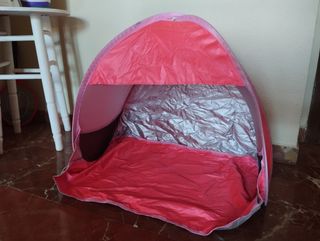 Tienda plegable de protección contra el sol para mascotas tamaño pequeño o mediano, talla L. Incluye funda de transporte con velcro. Un sólo uso. Medidas: 56 cm alto. 60cm ancho. 48cm fondo. Entrega en mano o envío.