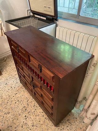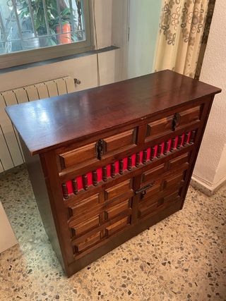 Mueble de madera con un diseño clásico y elegante. Con ruedas - Acabado en tono marrón oscuro. - Detalles en color rojo en la parte central. - Tiradores metálicos. Es un somier plegado para colchón. Cama supletoria El colchón esta para cambiar. Esta en el Zaidín - Vergeles