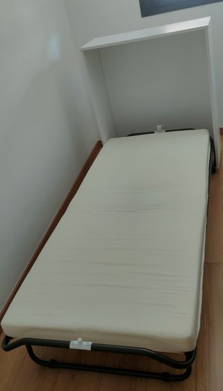 Cama plegable individual, ideal para espacios reducidos. Se pliega fácilmente y se guarda en su armario. Diseño italiano de calidad. Está prácticamente nueva, casi no usada. Comprada el marzo, tal y como se puede ver en la factura de compra. - Estructura metálica. - Tapizado de tela. - Perfecta para invitados.