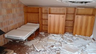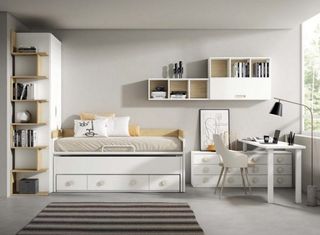 Armario rincón chaflán-recto de 218x154,7x98 con doble puerta plegable. Mesita chaflán de 47,5x41 con 2cajones con ruedas. Soporte metálico lateral mesa de estudio, de 49x71,5. Costado mesa estudio lateral, de 48,9x25x71,5. Encimera recta de 151cm con terminación curva. Módulo para colgar de 103cm con puerta con pulsador y hueco. Módulo de 103cm para colgar con puerta, pulsador y hueco. Compacto bicolor de 90x190 con nido oculto con ruedas de 90x180 y módulo de 4 contenedores. Medidas de 96x101x203. Compacto y nido necesitan somier. Altura libre nido oculto de 29cm. Incluye colchones. Transporte y montaje incluido en Barcelona.