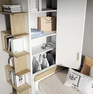 Cama individual con armario superior. A la derecha estanterias y a la izquierda barra para colgar. Incluye tambien una pequeña mesa plegable. Está nuevo y es de muy buena calidad. Lo vendo porque no uso la cama y necesito espacio de almacenaje.