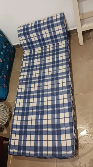 Cama plegable con un diseño a cuadros en tonos azules y beige. Es una pieza práctica y cómoda. - Tapicería de tela. - Patrón de cuadros.
