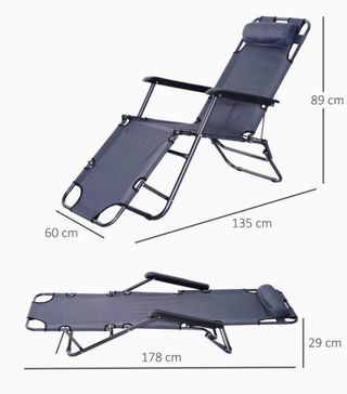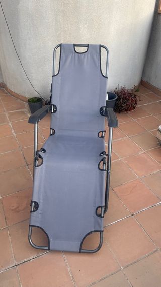 Tumbona plegable que se convierte en cama, ideal para exteriores. Cojín para cabeza. Vino con un problema de fabrica en uno de los laterales donde se apoyan los pies. Opción de comprar 2 por 80€, la segunda esta mas desgastada. - Medidas: 135 cm (largo) x 60 cm (ancho) x 89 cm (alto). - Medidas cama: 178 cm (largo) x 29 cm (alto).