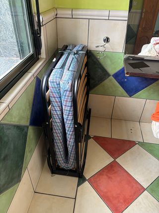 Cama plegable de metal, color marrón, ideal para espacios reducidos. Se pliega fácilmente para ahorrar espacio, para meterla bajo de otra cama. - Medidas aproximadas: 175cm de largo x 70cm de ancho. - Estructura metálica resistente. - Perfecta para invitados o uso ocasional. Ideal para una segunda vivienda. - Regalo colchon. - En buenas condiciones tanto la cama-somier como el colchón. - NO HAGO EMBIOS. La recogida y el transporte es por cuenta del comprador.