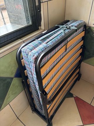 Cama plegable de tamaño individual, ideal para espacios reducidos o como cama extra. - Estructura metálica robusta. - Base de láminas de madera. - Colchón incluido con funda a cuadros.