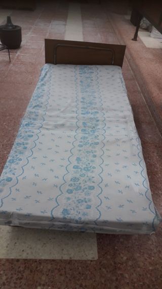 Se vende Cama plegable. Medidas: alto 98 ,ancho arriba 37,5, abajo 40 ; largo 80 ; La colchoneta está poco usada y el somier en buen estado. Ideal para casa con invitados. las telas azules bordadas no se venden.