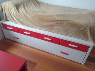 Vendo habitación juvenil formada por 4 piezas. Una cama nido (una cama arriba, 4 cajones entre las dos camas y otra cama con patas plegables que se guarda debajo, un mueble con 4 armarios y 4 estanterías, un arcón que hace de cabecero y mesita de la cama y una estantería con fondo de madera rojo.