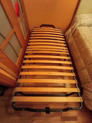 Estructura de cama plegable con ruedas, impecable. - Medidas de 90x200cm. - Diseño plegable para fácil almacenamiento. - Con funda - Base de láminas de madera. - Marco resistente.
