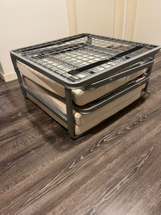 Cama plegable de 80 cm que se transforma en un puff. - Estructura metálica. - Láminas de madera.