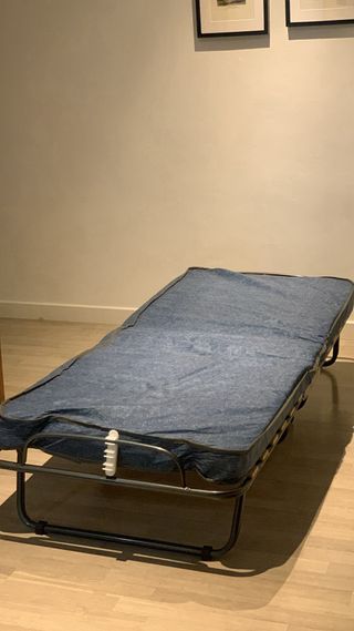 Cama plegable de la marca Colchones Aznar. Fácil de guardar y transportar. Una semana de uso. - Estructura de metal y madera. - Tapizado en tela. - Medidas plegada: 85x110cm - Medidas extendida: 85x185cm